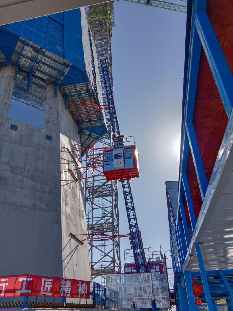 廊坊凱博建設機械科技有限公司根據(jù)枝江百里洲長江大橋的外形和具體施工要求,提供了SC200型斜直兩用施工升降機設備。該型升降機適用于外立面呈異型或變斜度大的橋塔、煙囪等建筑物施工中,在不增加任何部件的情況下可滿足在不同斜度建筑物的使用要求,能做到在0~15°之間任意變換角度,具有良好的適應性。
